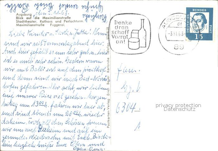 72182987 alte Postkarte Augsburg Maximilianstrasse Stadttheater Perlachturm Fuggerei postalisch gelaufen Erhaltung siehe scans KatCode: 11110009761000