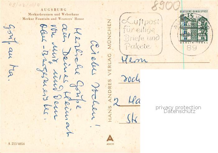 73867586 alte Postkarte Augsburg Merkurbrunnen und Weberhaus postalisch gelaufen Erhaltung siehe scans [WerneD78] KatCode: 11110009761000