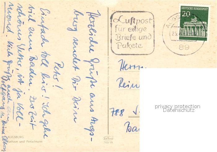73004103 alte Postkarte Augsburg Rathaus mit Perlachturm postalisch gelaufen Erhaltung siehe scans [WerneD78] KatCode: 11110009761000