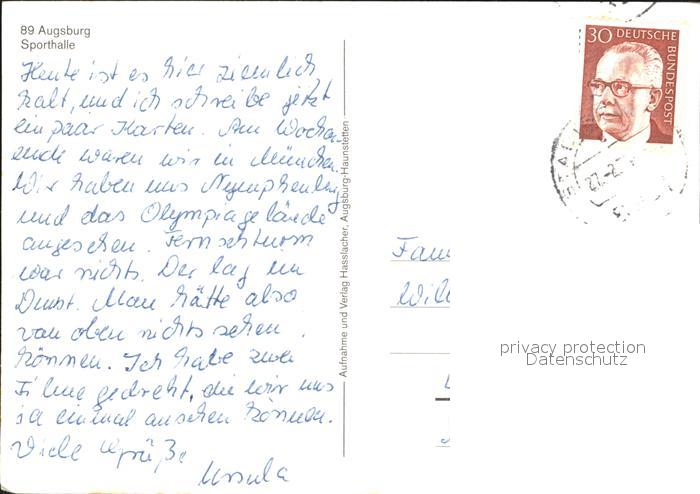 72223381 alte Postkarte Augsburg Sporthalle postalisch gelaufen Erhaltung siehe scans KatCode: 11110009761000
