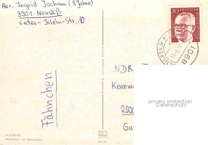 72662826 alte Postkarte Augsburg Weberhaus am Moritzplatz ehemaliges Zunfthaus Brunnen postalisch gelaufen Erhaltung siehe scans [FriedD77] KatCode: 11110009761000