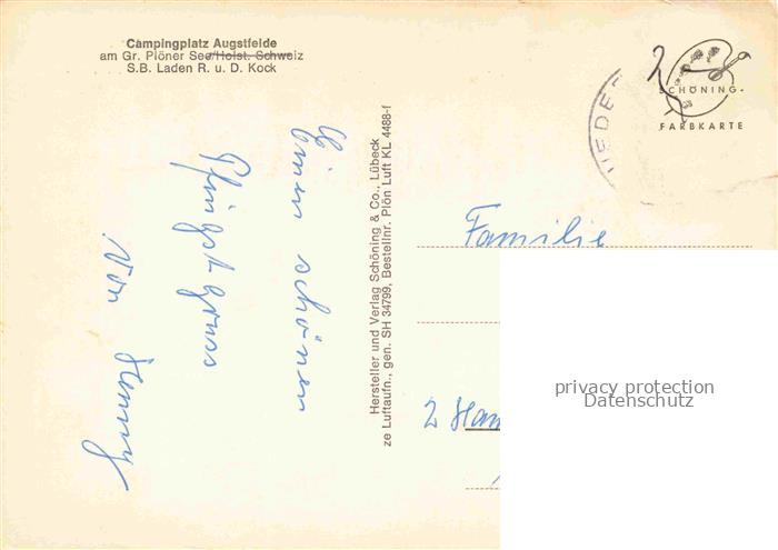 74141830 Augstfelde PLoeN Schleswig-Holstein Campingplatz postalisch gelaufen Fliegeraufnahme Erhaltung siehe scans [FriedD77] Fliegeraufnahme alte Postkarte Frie Katcode 11110001057057