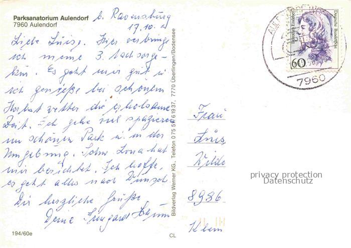 74053396 alte Postkarte Aulendorf Parksanatorium postalisch gelaufen Erhaltung siehe scans [WerneD78] KatCode: 11110008436008