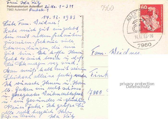 74053395 alte Postkarte Aulendorf Parksanatorium postalisch gelaufen Erhaltung siehe scans [WerneD78] KatCode: 11110008436008