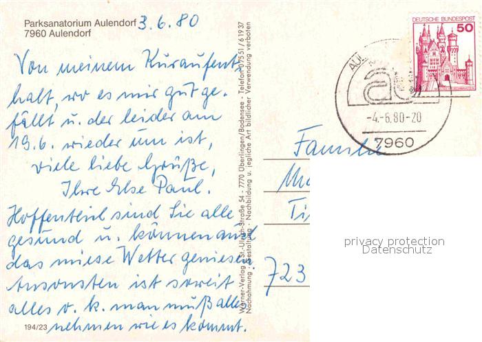72727764 alte Postkarte Aulendorf Parksanatorium postalisch gelaufen Erhaltung siehe scans [LiesaD40] KatCode: 11110008436008