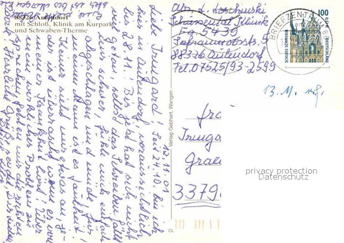 72828805 alte Postkarte Aulendorf Schloss Klinik Schwaben-Therme postalisch gelaufen Erhaltung siehe scans [NatalD47] KatCode: 11110008436008
