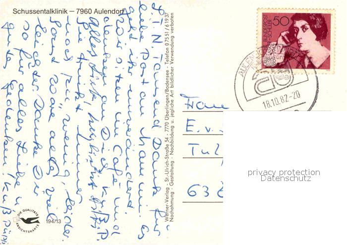 72772117 alte Postkarte Aulendorf Schussentalklinik postalisch gelaufen Erhaltung siehe scans [LiesaD40] KatCode: 11110008436008