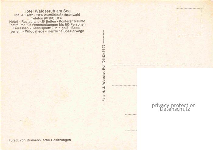 74109642 Aumuehle Lauenburg Hotel Waldesruh am See postalisch nicht gelaufen Erhaltung siehe scans [WerneD78] KatCode: 11110001053003