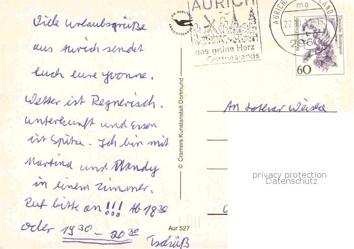 72639660 alte Postkarte Aurich Ostfriesland Stiftsmuehle Pingelhus Brunnen Ostriesische Landschaft Burgstrasse Rathausplatz Kloenschnack Skulpturen postalisch gelaufen Erhaltung siehe scans [FriedD77] KatCode: 11110003452001