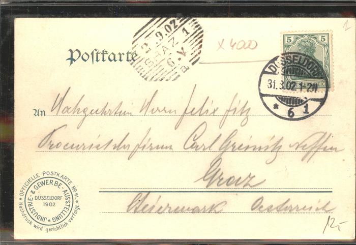 41400165 alte Postkarte Ausstellung Industrie Gewerbe Kunst Duesseldorf 1902 Hauptweinrestaurant postalisch gelaufen gute Erhaltung KatCode: 11110005111000