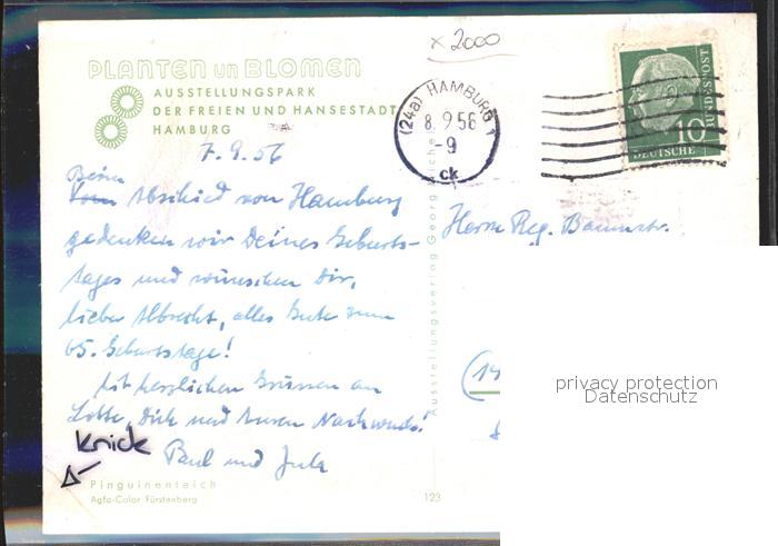 alte Postkarte Ausstellung Planten un Bloemen Hamburg Pinguinenteich postalisch gelaufen Erhaltung siehe scans