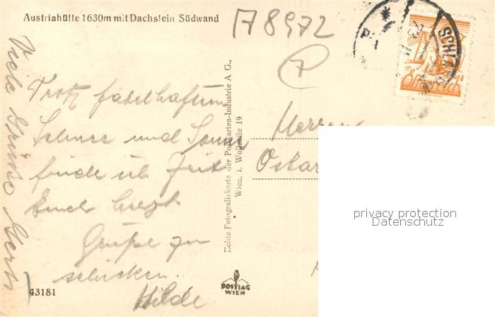 43107542 alte Postkarte Austriahuette Berghuette mit Dachstein Suedwand Dachsteingebirge postalisch gelaufen Erhaltung siehe scans [FriedD77] KatCode: 11390