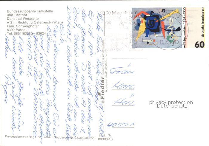 alte Postkarte Autobahn Tankstelle Rasthof Donautal-West Passau postalisch gelaufen Erhaltung siehe scans