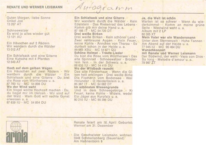 74026989 Autogramm Renate Werner Leismann postalisch nicht gelaufen Erhaltung siehe scans [SanaeD93] KatCode: 22400000000900