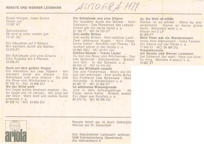 74026990 Autogramm Renate Werner Leismann postalisch nicht gelaufen Erhaltung siehe scans [SanaeD93] KatCode: 22400000000900