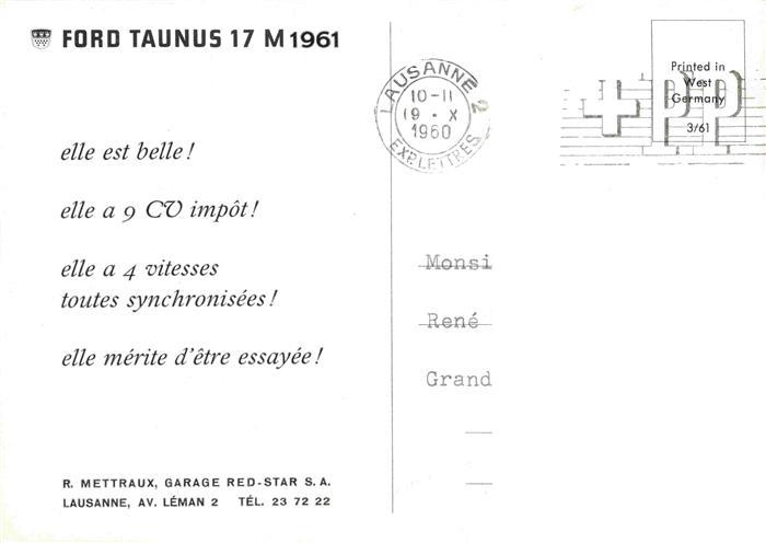 74027209 alte Postkarte Autos Cars Voitures– Ford Taunus 17 M 1961 Lausanne postalisch gelaufen Erhaltung siehe scans [IrynaD87] KatCode: 22020000000300