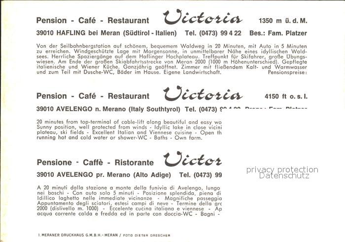 Avelengo Pension Cafe Restaurant Victoria postalisch nicht gelaufen Werbekarte (keine Postkarte) Erhaltung siehe scans