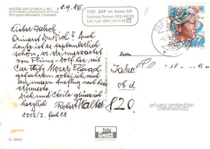 13866385 alte Postkarte Avers-Juf GR Gasthaus Pension Edelweiss Blick gegen Mazzaspitz Foppaspitz Alpen postalisch gelaufen Erhaltung siehe scans [FriedD77] KatCode: 11470100315028