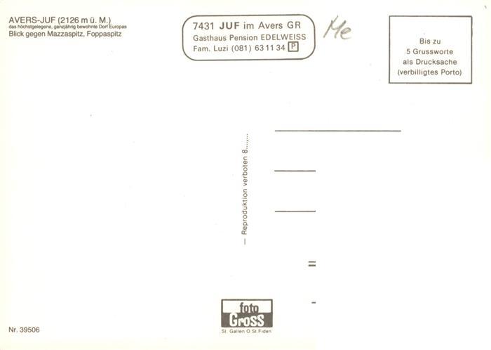13884264 Avers-Juf GR Gasthaus Pension Edelweiss mit Mazzaspitz Foppaspitz postalisch nicht gelaufen Erhaltung siehe scans [FriedD77] KatCode: 11470100315028