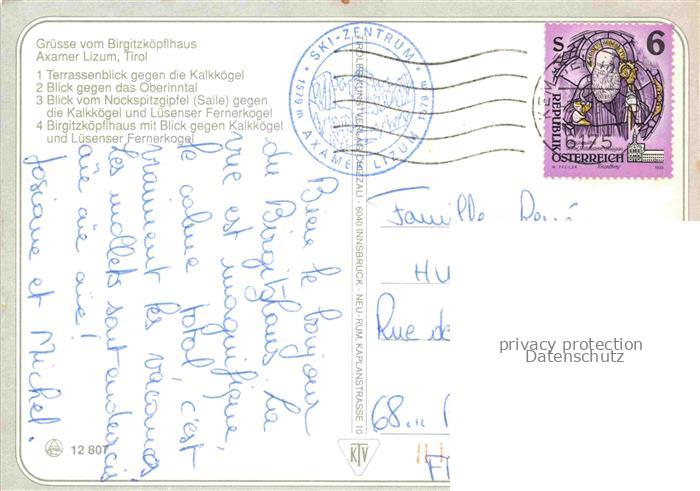 74009709 alte Postkarte Axamer Lizum Birgitzkoepflhaus Terrasse Oberinntalblick Nockspitzgipfel Birgitzkoepflhaus mit Kalkkoegel und Luesenser Fernerkogel postalisch gelaufen Erhaltung siehe scans [WerneD78] KatCode: 11390332070304