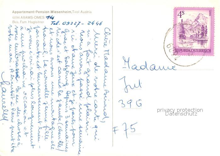 13326938 alte Postkarte Axams Appartement Pension Wiesenheim postalisch gelaufen Erhaltung siehe scans [KathaD81] KatCode: 11390332070304