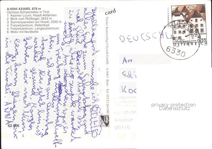 72446474 alte Postkarte Axams Lizium Hoadl Abfahrten Rosskogel Freizeitzentrum Hallenbad postalisch gelaufen Erhaltung siehe scans KatCode: 11390332070304
