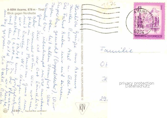72862690 alte Postkarte Axams mit Nordkette postalisch gelaufen Erhaltung siehe scans [WerneD78] KatCode: 11390332070304
