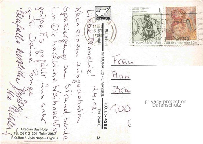 74109905 old postcard Ayia Napa Agia Napa Cyprus Grecian Bay Hotel Fliegeraufnahme postalisch gelaufen Erhaltung siehe scans [WerneD78] KatCode: 13190