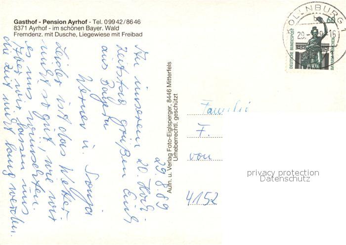 73651492 alte Postkarte Ayrhof Gasthof Pension Ayrhof im Bayerischen Wald Kapelle postalisch gelaufen Erhaltung siehe scans [FriedD77] KatCode: 11110009276128