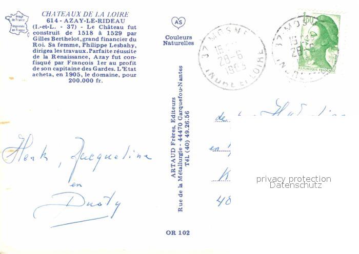 12668018 carte postale Azay-le-Rideau Chateau de la Loire postalisch gelaufen Erhaltung siehe scans [WerneD78] KatCode: 11170037137014