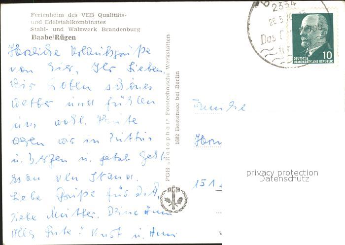 72079021 alte Postkarte Baabe Ostseebad Ruegen Ferienheim des VEB Kombinats Stahl und Walzwerk Brandenburg postalisch gelaufen Erhaltung siehe scans KatCode: 11110013061003