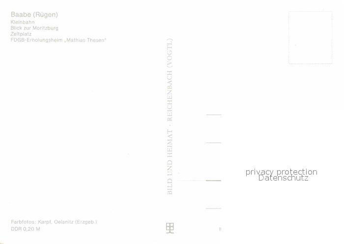 72667539 Baabe Ostseebad Ruegen Kleinbahn Moritzburg Zeltplatz Erholungsheim Mathias Thesen postalisch nicht gelaufen Erhaltung siehe scans [AndreD76] KatCode: 11110013061003