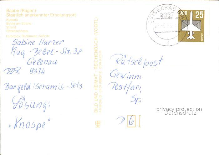72391270 alte Postkarte Baabe Ostseebad Ruegen Kurpark Strand Rohrdachhaus Boote am Strand postalisch gelaufen Erhaltung siehe scans KatCode: 11110013061003