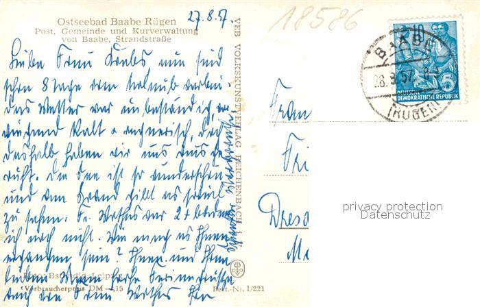 72634679 alte Postkarte Baabe Ostseebad Ruegen Post Gemeinde Kurverwaltung Strandstrasse postalisch gelaufen Erhaltung siehe scans [KathaD79] KatCode: 11110013061003