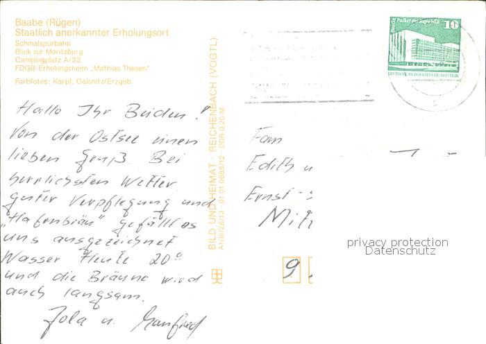 72326128 alte Postkarte Baabe Ostseebad Ruegen Schmalspurbahn Moritzburg Campingplatz FDGB Erholungsheim Mathias Thesen postalisch gelaufen Erhaltung siehe scans KatCode: 11110013061003