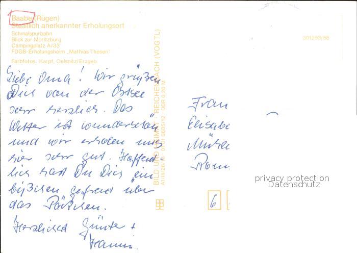 72328052 alte Postkarte Baabe Ostseebad Ruegen Schmalspurbahn Moritzburg Campingplatz postalisch gelaufen Erhaltung siehe scans KatCode: 11110013061003