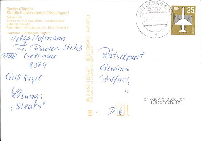 72461674 alte Postkarte Baabe Ostseebad Ruegen Strand HO Gaststaette Inselparadies Schmalspurbahn postalisch gelaufen Erhaltung siehe scans KatCode: 11110013061003