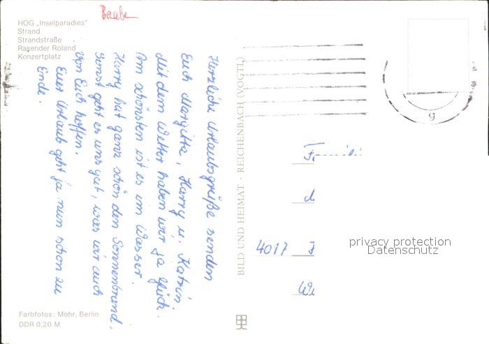 72328038 alte Postkarte Baabe Ostseebad Ruegen Strand Strandstrasse Rosender Roland Konzertplatz postalisch gelaufen Erhaltung siehe scans KatCode: 11110013061003