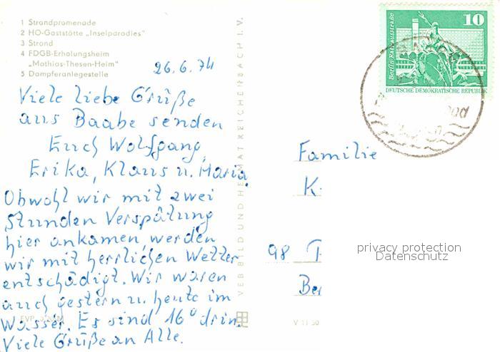 72727408 alte Postkarte Baabe Ostseebad Ruegen Strandpromenade HO Gaststaette Inselparadies Strand FDGB Erholungsheim Dampferanlegestelle postalisch gelaufen Erhaltung siehe scans [FriedD77] KatCode: 11110013061003