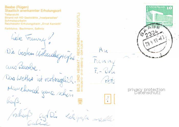 72884580 alte Postkarte Baabe Ostseebad Ruegen Teilansicht Strand HOG Inselparadies Schmalspurbahn Reichsbahn Erholungsheim postalisch gelaufen Erhaltung siehe scans [WerneD78] KatCode: 11110013061003