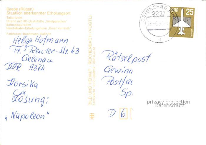 72413610 Baabe Ostseebad Ruegen Teilansicht Strand mit Gaststaette Inselparadies Schmalspurbahn postalisch nicht gelaufen Erhaltung siehe scans Alte Ansichtskarte Postkarte Andr Katcode 11110013061003