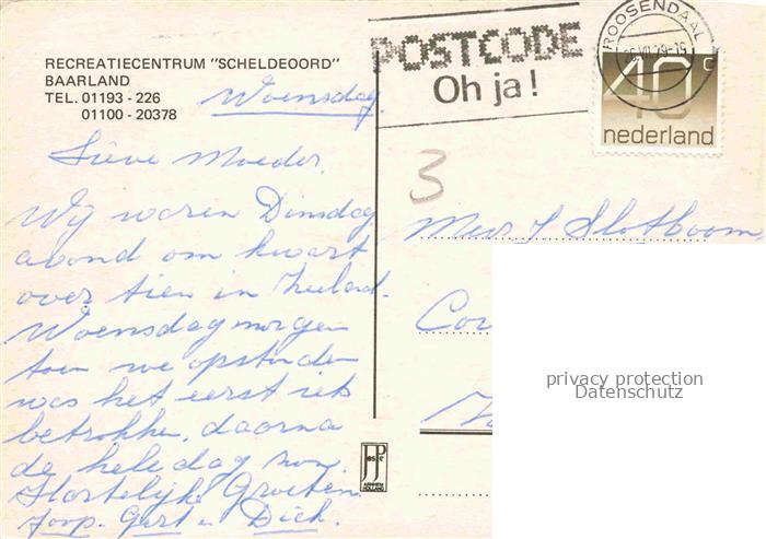 74005622 old postcard Baarland Zeeland NL Recreatiecentrum Scheldeoord Wohnwagen Gefluegelfuetterung Pool Bar postalisch gelaufen Erhaltung siehe scans [WerneD78] KatCode: 11370