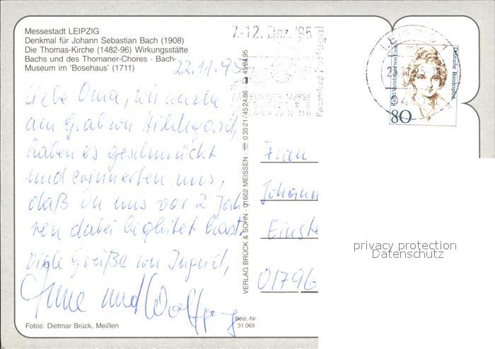 alte Postkarte Bach Johann Sebastian Denkmal Leipzig Thomas-Kirche Bachmuseum Bosehaus postalisch gelaufen Erhaltung siehe scans