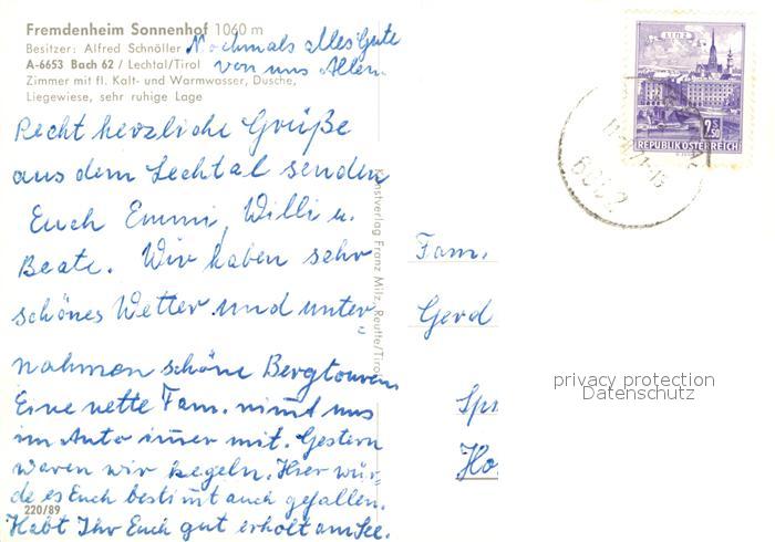 73175704 alte Postkarte Bach Tirol Fremdenheim Sonnenhof postalisch gelaufen Erhaltung siehe scans [NatalD47] KatCode: 11390331070801