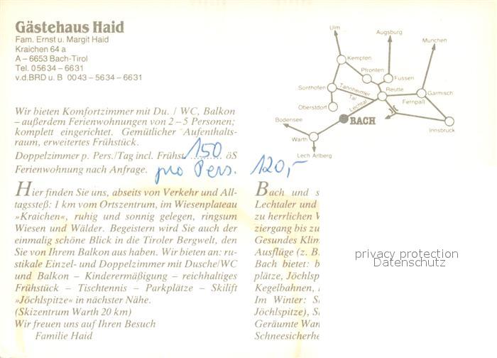 73073495 Bach Tirol Gaestehaus Haid Lechtal Alpenpanorama postalisch nicht gelaufen Werbekarte (keine Postkarte) Erhaltung siehe scans [FriedD77] KatCode: 11390331070801