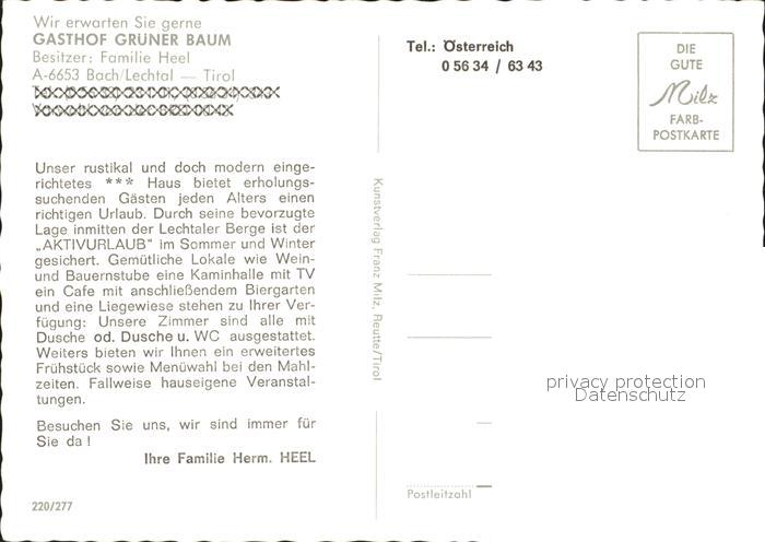 72270319 Bach Tirol Gasthof Gruener Baum im Lechtal postalisch nicht gelaufen Erhaltung siehe scans KatCode: 11390331070801