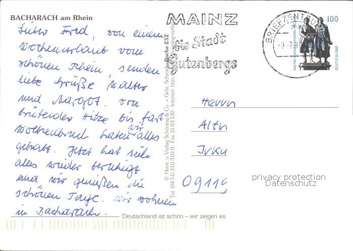 72375265 alte Postkarte Bacharach Rhein Altes Haus Oberstrasse Marktturm Kurpfaelzische Muenze Peterskirche Fachwerkhaus Malerwinkel Alter Posthof postalisch gelaufen Erhaltung siehe scans KatCode: 11110007339003
