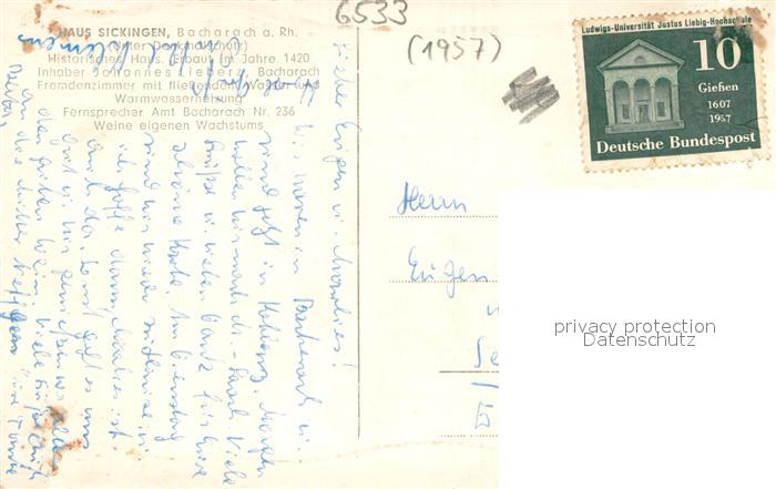 73691170 alte Postkarte Bacharach Rhein Haus Sickingen Hotel Restaurant Historisches Gebaeude 15. Jhdt. postalisch gelaufen Erhaltung siehe scans [FriedD77] KatCode: 11110007339003