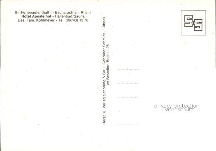 72308965 Bacharach Rhein Hotel Apostelhof Hallenbad Rheinpartie postalisch nicht gelaufen Erhaltung siehe scans KatCode: 11110007339003