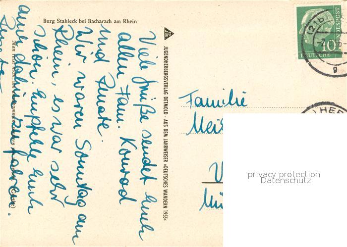 73686280 alte Postkarte Bacharach Rhein Jugendherberge Burg Stahleck Blick auf den Rhein postalisch gelaufen Erhaltung siehe scans [FriedD77] KatCode: 11110007339003